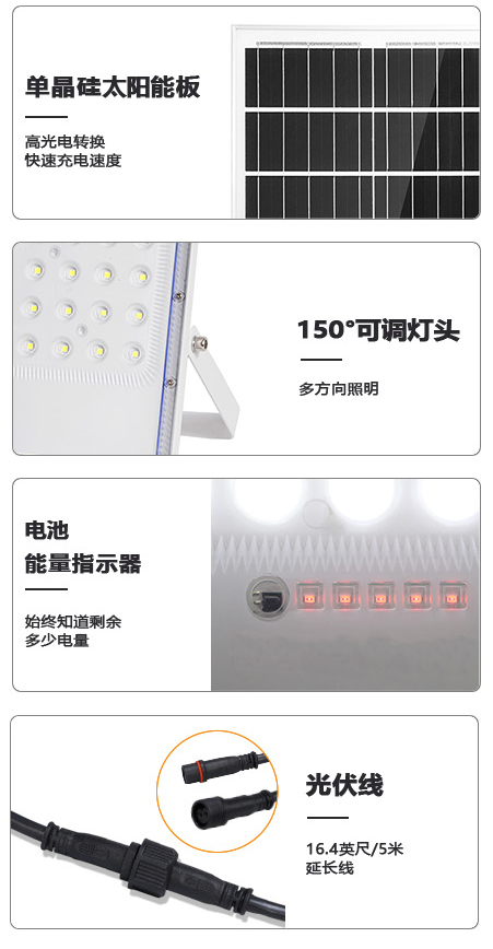 9.单晶硅太阳能板,高光电转换。150°摇杆可调灯头方向,多方向照明。电池能量指示器,能精准清楚剩余多少电量。光伏线16.4英尺/5米延长线。