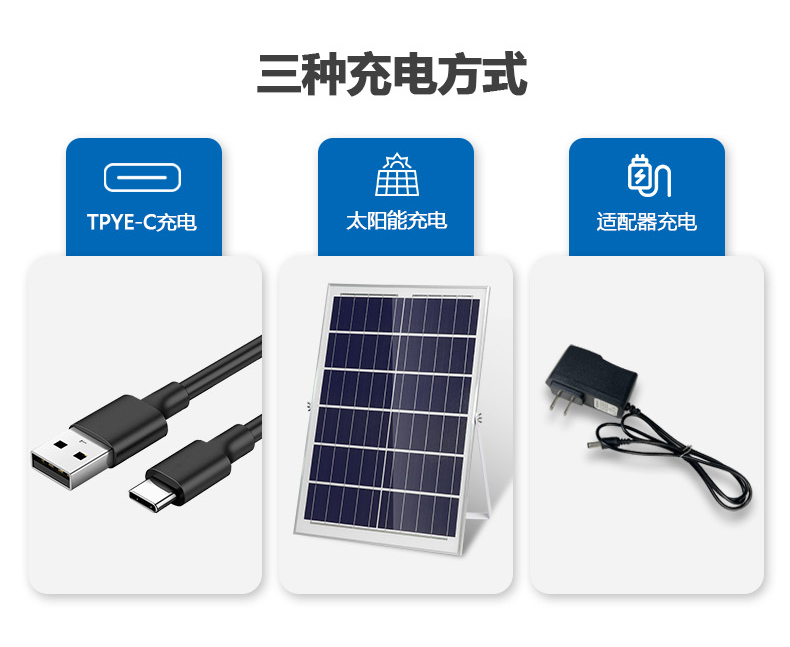 2.太阳能风扇,太阳能板、TPYE-C、适配器多方向充电。
