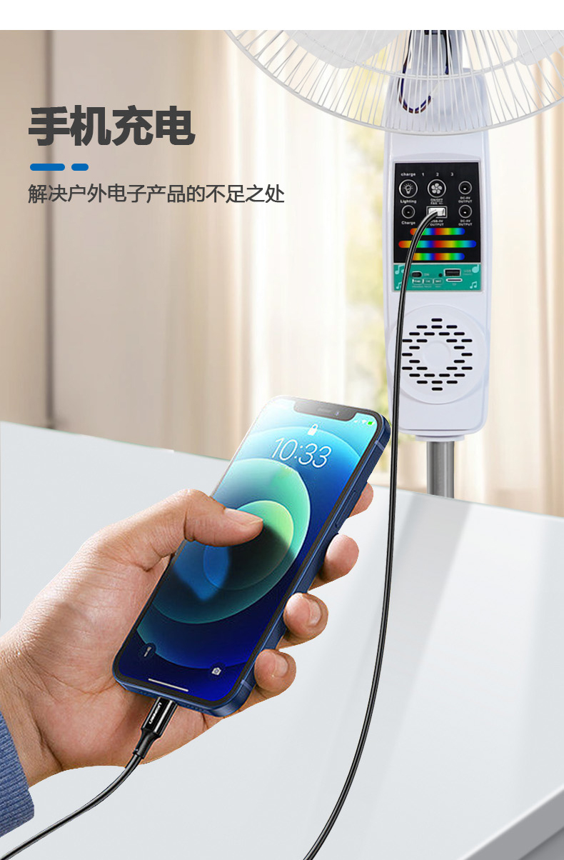 4.可输出给手机充电,解决户外电子产品的不足之处,或连接驱蚊灯泡可移动光源。