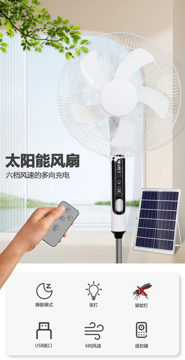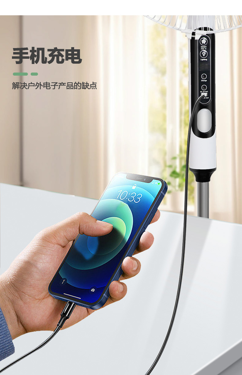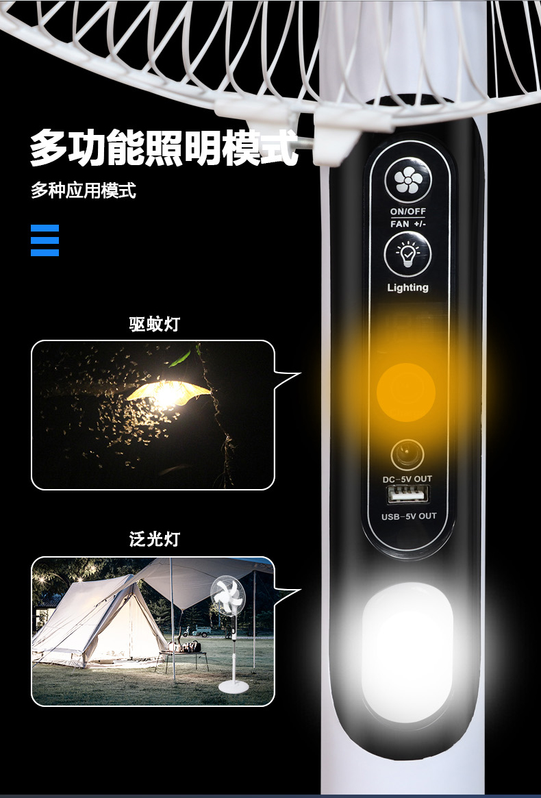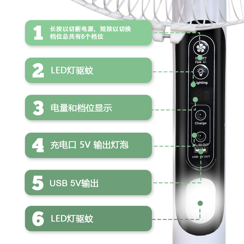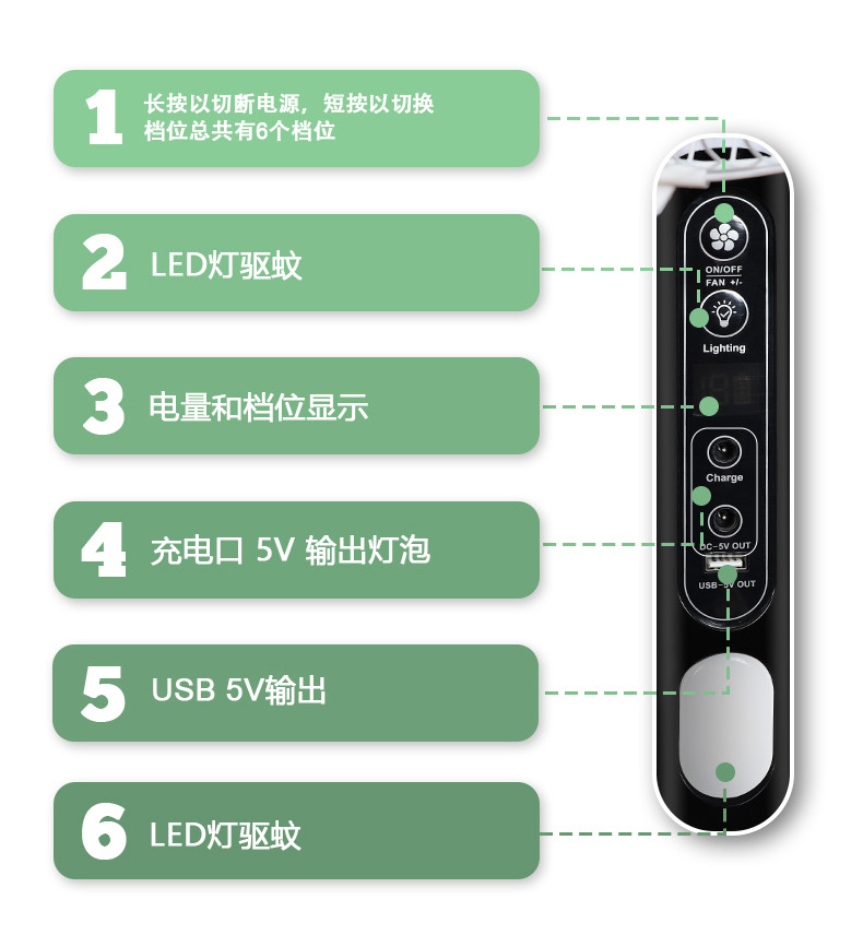 1.多功能操作面板:6档风力调节、LED驱蚊灯、电量和档位显示、充电口5V输出灯泡、USB 5V输出。