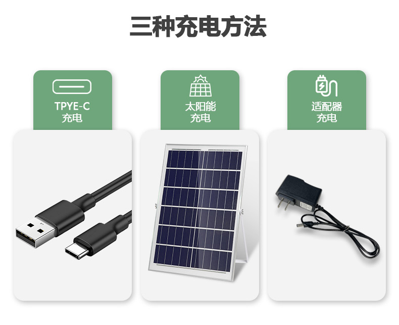 2.三种充电方式:TPYE-C充电、太阳能充电、适配器充电。